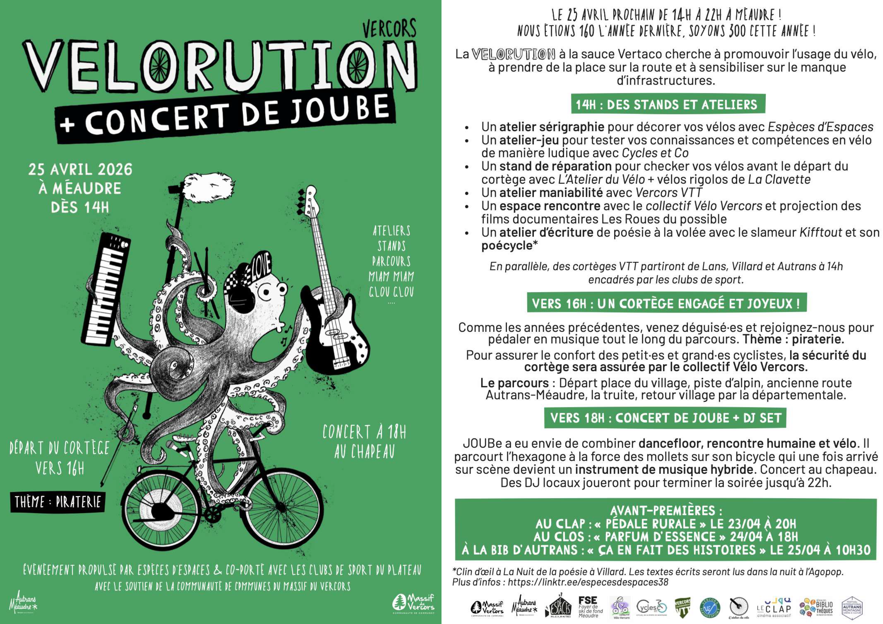 dès 14h ralliement à vélo depuis les principaux villages du Vercors vers le cortège déguisé qui partira de Méaudre (à 16h),projections (le jour J et quelques jours avant au Clap), ateliers réparation vélo, ateliers ludiques et décoratifs, vélos rigolos, et un concert tout particulier à la fin de la journée avec un artiste ayant fait de son vélo son instrument de musique ! De nombreux partenaires se sont mobilisés autour de cette journée portée par Espèces d'Espaces.